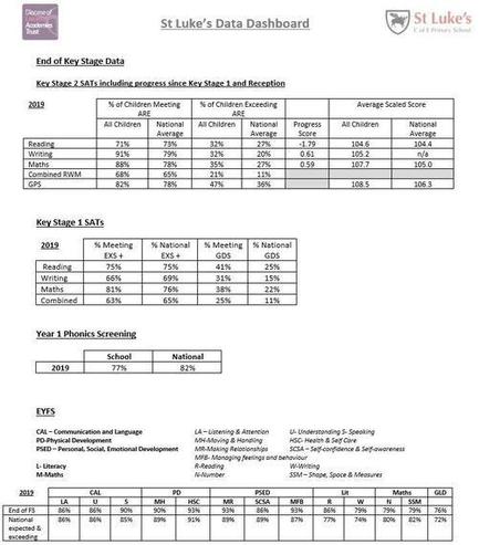 This shows the school's performance tables for EYFS, Year 1 Phonics, Key Stage 1 Assessments and Key Stage 2 Assessments.